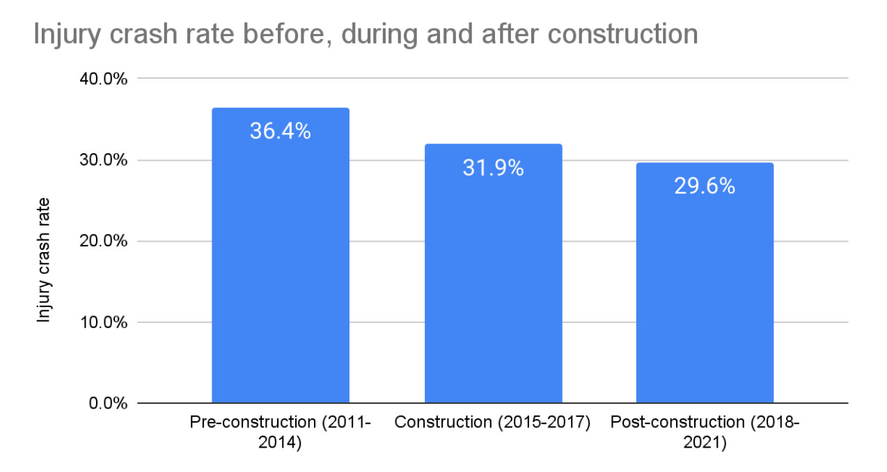 One thing we can say with relative certainty is that the proportion of injury crashes has fallen. For the four-year period prior to construction (2011 to 2014), injuries were reported in 36.4% of crashes. In the four years after (2018 to 2021), that has fallen to 29.6%. That means the rate of injury crashes fell roughly 20%, in line with MnDOT’s prediction.